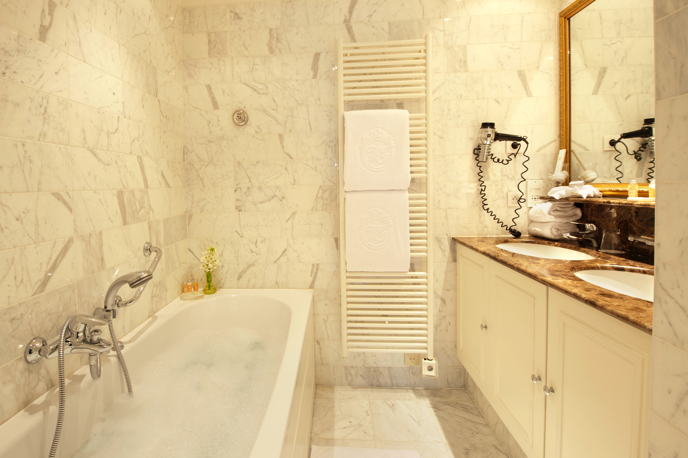Nos chambres Classic sont compactes et élégamment décorées dans le style classique Louis XVI, avec des technologies modernes et des équipements de haute qualité pour assurer un séjour confortable. La salle de bain en marbre est équipée d’une unique vasque, d’une douche baignoire (2 en 1) et WC. Un lit supplémentaire n’est pas envisageable dans cette chambre, seulement un lit bébé.